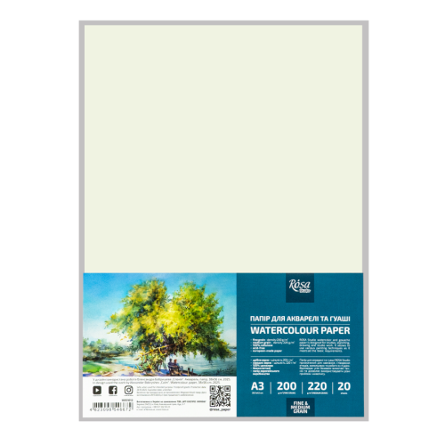 Купить бумагу для акварели (пакет) А3 ROSA Studio 220–200 г/м² 20 листов (среднее и мелкое зерно) на Mir-arta — оригинальная продукция ROSA Studio по лучшим ценам с доставкой в Киев, Львов, Одессу, Днепр, Харьков и любой город Украины.