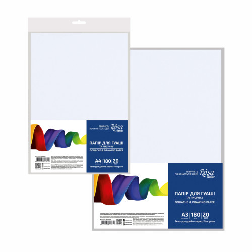 Бумага для гуаши от ROSA Studio разработана специально для обучения живописи. Ее текстура, плотность и проклейка соответствуют всем требованиям техники гуаши. Наборы содержат бумагу по 10 или 20 листов формата А4 и А3. Эта бумага идеально подходит для работы гуашью, карандашами, лайнерами и маркерами на водной основе.