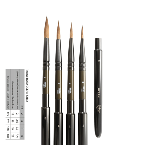 Кисти серии TRAVEL BRUSH ROSA оборудованы специальным защитным колпачком, защищающим волосы от механических повреждений при транспортировке: рабочая часть кисти отсоединяется от металлической ручки и прячется внутрь колпачка. Это делает его компактным и позволяет легко уместиться в пенал или карман. Такие кисти идеально подходят для создания акварелей, скетчей в путешествиях и на пленэре. Кисти OCEAN ROSA круглой формы изготовлены из натурального волоса соболя и имеют особую конструкцию TRAVEL BRUSH . Натуральный волос соболя идеально держит кончик и форму пучка, отлично впитывает и отдает воду. Благодаря форме и свойствам волос кисти OCEAN универсальны для всех техник акварельной живописи. По качеству и свойствам кисти из волос соболя не уступают колонку.