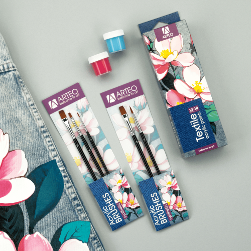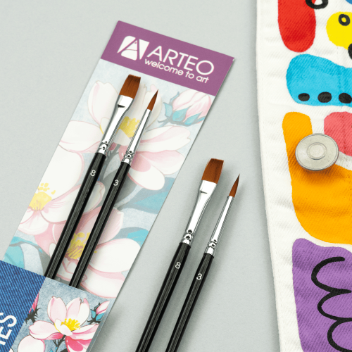 Набор кистей для росписи тканей Arteo №2 — универсальный комплект синтетических кистей для работы с акрилом по ткани, текстильным декором и декоративными проектами. Позволяет выполнять тонкие контуры, детализацию и быстрое заполнение больших площадей цветом.