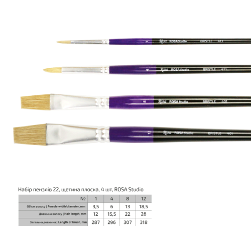 Описание Набори кистей 22, щетина, 4 шт круглая №1,4, плоская №8,12, д.р ROSA Studio 186121