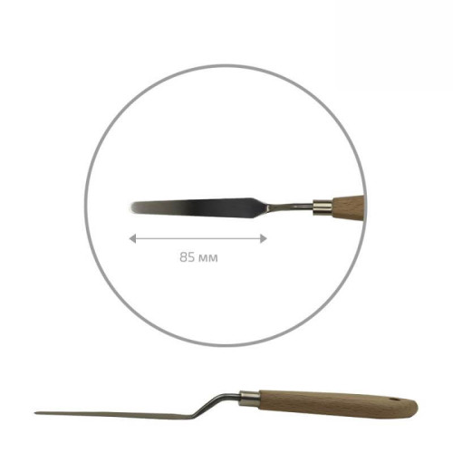 Мастихины представлены в 20-ти основных размерах и формах, таких как: капля, ромб, прямоугольный. Цельнотянутый, имеет деревянную ручку, достаточно надёжен и долговечен.