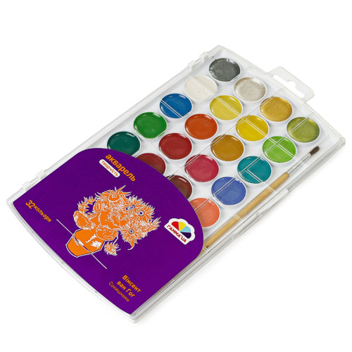 Отзывы о Акварель медовая "Творчество", 32 цв.(28+4перлам.), с/кисточкой, пластик, ГАММА