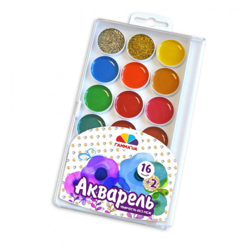 Описание Набор медовой акварели "Творчество" 18 цв., зол. и ср., б/кисти, ГАММА