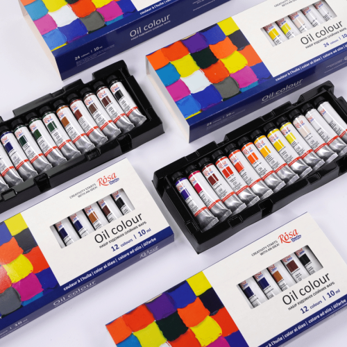 Наборы представлены в картонных коробках с уникальным дизайном, тюбики размещены в пластиковом блистере для удобства во время использования. Изготовлены из высококачественных пигментов на основе льняного полимеризованного масла, художественные масляные краски ROSA Studio имеют чистые цвета и естественный блеск. Кремовая консистенция позволяет легко работать с краской сразу из тюбы без дополнительного разведения.