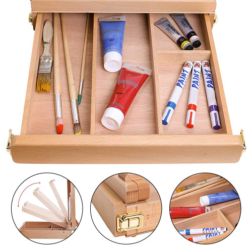 Встроенный лоток позволяет держать все необходимые материалы под рукой, а прочная буковая конструкция гарантирует устойчивость даже при активной работе. Это практичный, красивый и очень удобный мольберт для художников, которые ценят порядок и функциональность.
