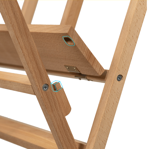 Размеры: 60×30×73 см. Материал: натуральный бук с гладкой шлифовкой. Конструкция: складная, легкая, но очень прочная с усиленными опорными рейками. Подходит для работ малого и среднего формата.