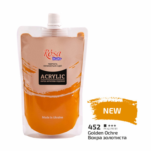 Купуйте Фарба акрилова, Вохра золотиста (452), 200 мл, ROSA Studio онлайн, та отримайте можливість творити неповторні шедеври з найкращими матеріалами. Доставка по Україні!