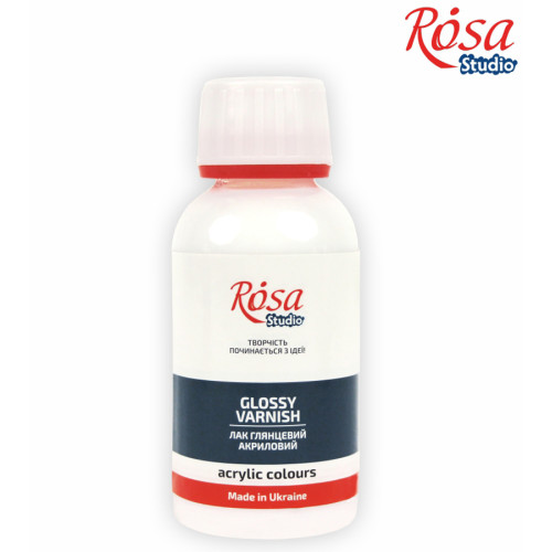 Купити Лак акриловий глянцевий, 500 мл, ROSA Studio - найкращий вибір для покриття закінчених живописних робіт, акриловими фарбами та поверхонь виробів з дерева. Цей лак на водній основі швидко сохне, не має запаху і утворює міцну глянцеву плівку, яка не змивається водою.