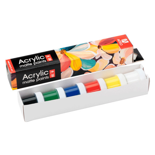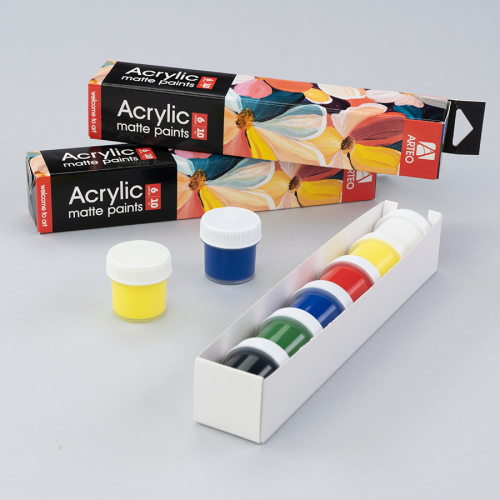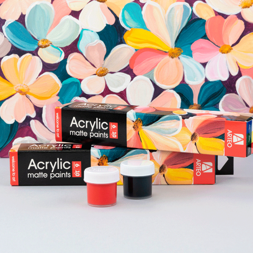Матові акрилові фарби створюють м’які природні переходи кольору та глибину тону. Вони легко наносяться, рівномірно покривають поверхню, швидко висихають і не потребують розведення. Завдяки водній основі інструменти легко очищуються звичайною водою.