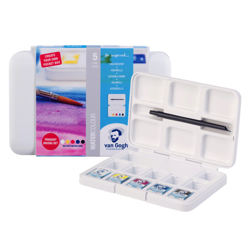 Купити набір акварельних фарб VAN GOGH PRIMARY зі 5 кюветами в пластиковому пеналі від Royal Talens зараз! Цей набір містить 3 базові кольори, а також чорний та білий, пензель №6 та піддон для змішування кольорів. За допомогою цих фарб можна створити нескінченну палітру відтінків, що ідеально підійде для новачків, студентів та професіоналів.