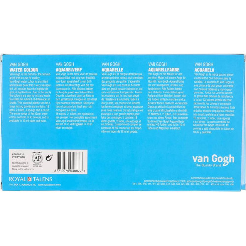 Основні характеристики Набір акварельних фарб, VAN GOGH, 18 кювет+2*10 мл (Біла, Сірий пейна), +пензлик, +спонж, пластик, Royal Talens