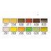 : Охра жовта (227), Сієна натуральна (234), Умбра натуральна (408), Сієна палена (411), Умбра палена (409), Ван-Дік коричневий (403), Титановий буфф (291), AZO Жовтий середній(269), Перм. оранжевий (266), Соковитий зелений (623), Оливковий зелений (620), Азометин зелено-жовтий (296).