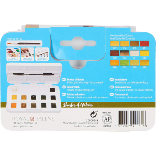 Опис Набір акварельних фарб, VAN GOGH, Pocket box SHADES OF NATURE, 12 кювет+пензлик, пластик, Royal Tale