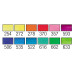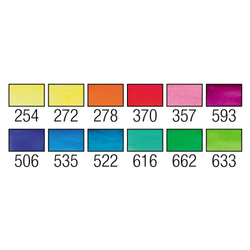 : Перм. лимонний світлий (254), Прозорий жовтий середній (272), Пірольний помаранчевий (278), Перм. червоний світлий (370), Рожевий (357), Хінакрідон фіолетово-синій (593), Ультрамарин темний (506), Церулеум блакитний ФЦ (535), Бірюзово-синій (522), Зелений вірідоновий (616), Перм. зелений (662), Перм. жовто-зелений (633).