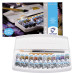 12 кольорів в кюветах, пензлик, в пластиковому пеналі.
