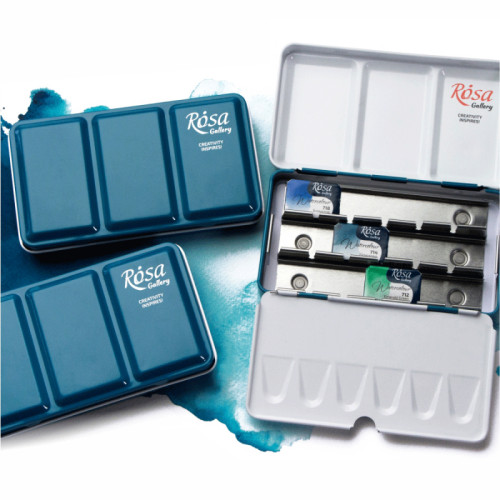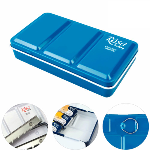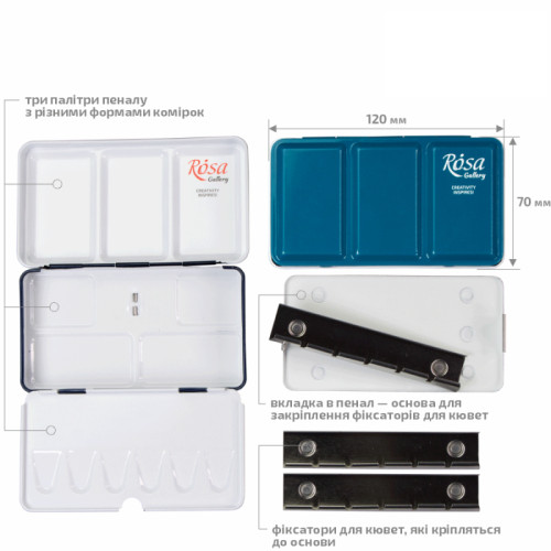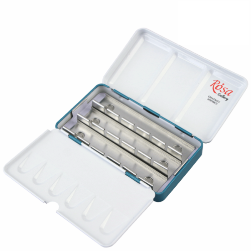 Пенал на 12 (22х7х2,3 см) повний кювет - це необхідний аксесуар для митців, які подорожують і працюють на відкритому просторі. < color="#414141" style="">Металічний пенал для акварелі ROSA Gallery мають дві вбудовані палітри різної конфігурації, спеціальну вставку для додаткового кювету і фіксатор для пальця на звороті пенала, що дозволяє легко утримувати фарби в руці під час роботи.< /h3>