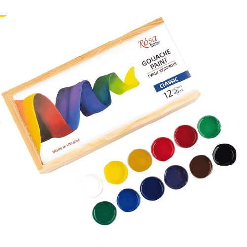 Опис Набір гуашевих фарб CLASSIC, 12*40мл, дерев’яний пенал, ROSA Studio