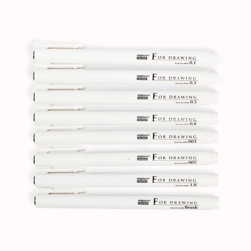 Набір чорних лайнерів Marvy Drawing Pen 8 шт — професійні інструменти для каліграфії, манги, коміксів, ілюстрацій, креслення, ведення щоденників та підписів. Підходять для точної роботи з маркерами та олівцями, створюють чіткі, стабільні лінії.
