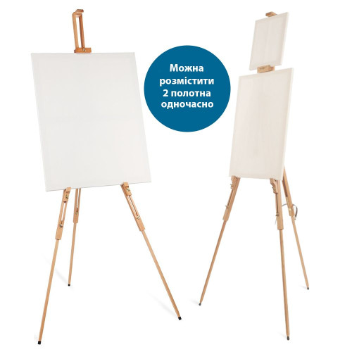 Завдяки регулюванню висоти до 192 см і максимальній висоті полотна 106 см мольберт підходить для різних технік і форматів. Міцна тринога рівномірно розподіляє навантаження і забезпечує стійкість навіть при активній роботі пензлем.