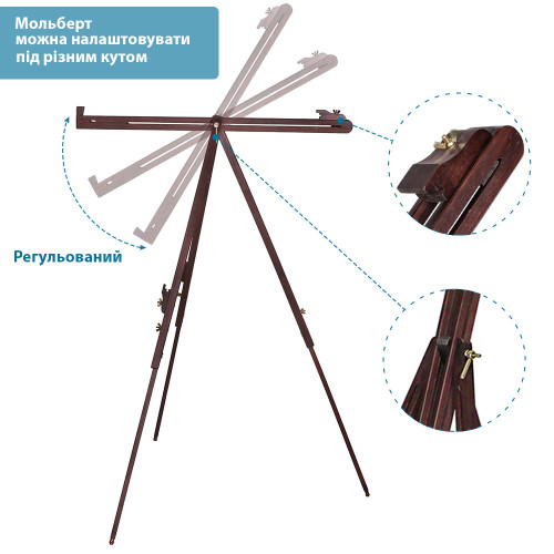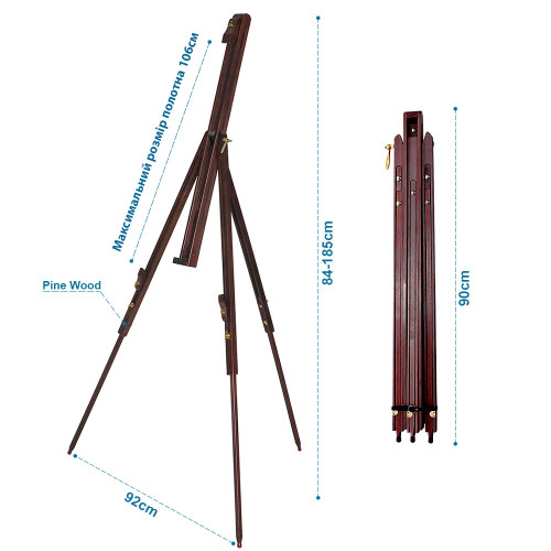 Мольберт легко розкладається і складається, що спрощує транспортування та зберігання. Регульована висота дозволяє адаптувати його під зріст художника і формат полотна, а стійка тринога зберігає стабільність навіть на нерівній поверхні.