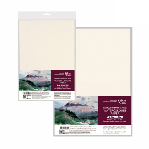 Папір для акварелі в пакеті дрібне зерно формат А4 20 аркушів 200 г/м2, ROSA Studio