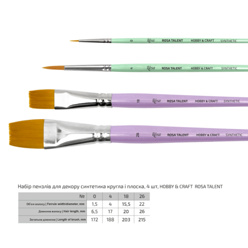 Опис Набір пензлів №4 ДЛЯ ДЕКОРУ, синтетика кругла та плоска, 4 шт №0,4,18,26 ROSA TALENT HCSET04