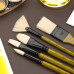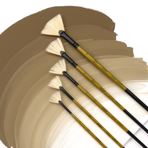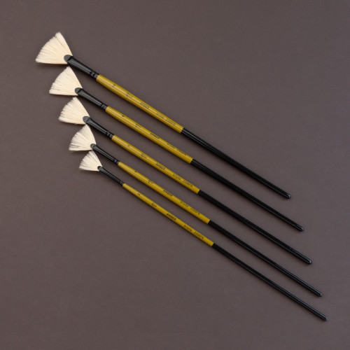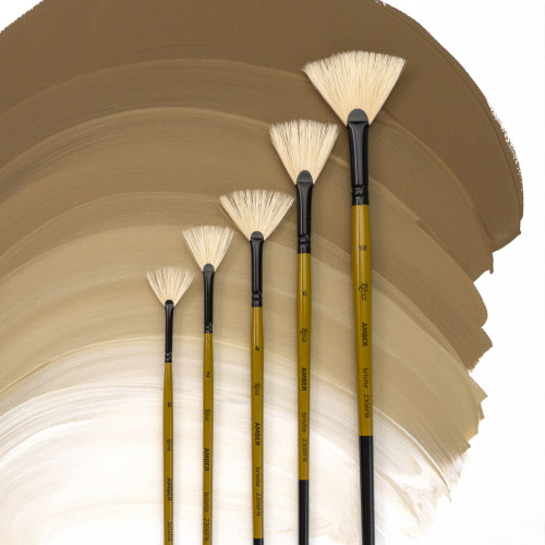 Форми пензлів серії AMBER на довгій ручці включають круглу, плоску, овальну, віялову та флейц. Віяловий пензель ідеально підходить для створення спеціальних ефектів та текстур, згладження переходів кольору і створення різноманітних елементів у малюнку.