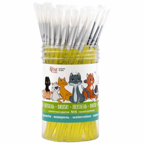 ROSA Kids — це дитяча серія з турботою про комфорт: пензлі легкі, не ковзають у руці та мотивують дитину малювати частіше. Жовтий колір ручки робить пензель помітним і привабливим для малюків. Разом з гуашшю, аквареллю, альбомами та пластиліном тієї ж серії створюйте цілу творчу колекцію з котиками та веселими пригодами!