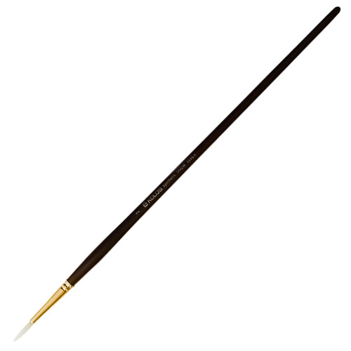 Пензель круглий з волоса синтетики. Стандартна виставка робочої частини. Білосніжний середньо пружний волос, який включив всі три важливі показники: здатності утворювати гострий кінчик, пружності волосяного пучка, контролю над текучістю фарби. Один з найбільш універсальних пензлів. Призначається для нанесення фарби лінією з незмінною товщиною, або лінією, що варіюється по товщині. Це чудовий пензель служить для малюнка, створення фактури, роботи над деталями.