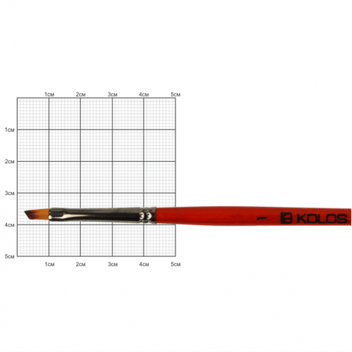 Пензель кутовий з волоса синтетики. Стандартна виставка робочої частини. Рижа синтетика імітація колонка, відрізняється винятковою еластичністю і пружністю волосяного пучка. Підрізаний під кутом плоский пензель з коротким волосом. Кінчик пензля дозволяє швидко і впевнено змінювати об’єм волоса який тримає фарбу, дана частина – неперевершений інструмент для створення переходу одного кольору в інший в важкодоступних, вузьких, дрібних частинах картини.