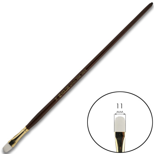 Пензель овальний з білого волоса синтетики. Стандартна виставка робочої частини. Білосніжний середньопружний волос, який включив всі три важливі показники: здатність утворювати гострий кінчик, пружність волосяного пучка, контроль над текучістю фарби. Універсальний пензель, ним можна малювати як звичайним плоским пензлем і, в той же час, в перпендикулярному положенні до поверхні - як круглим. Це - постійний лідер серед пензлів, використовуваних для переходу одного кольору в іншій.