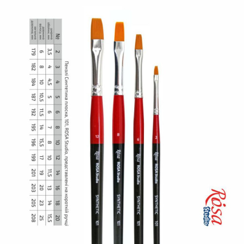 Пензель плоский ROSA Studio з волосу синтетики. Стандартна виставка робочої частини. Рижа синтетика, відрізняється винятковою еластичністю і пружністю волосяного пучка. Таким пензлем наносять широкі рівні мазки, ним добре працювати на великих ділянках полотна.  Завдяки густоті і довжині волосу пензель утримує багато фарби.