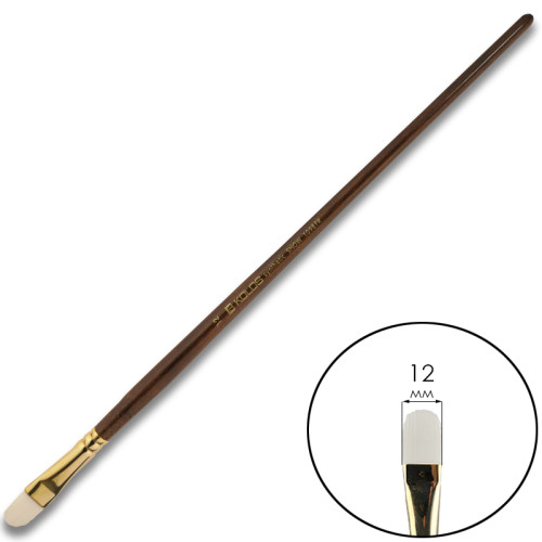 Пензель овальний з білого волоса синтетики. Стандартна виставка робочої частини. Білосніжний середньопружний волос, який включив всі три важливі показники: здатність утворювати гострий кінчик, пружність волосяного пучка, контроль над текучістю фарби. Універсальний пензель, ним можна малювати як звичайним плоским пензлем і, в той же час, в перпендикулярному положенні до поверхні - як круглим. Це - постійний лідер серед пензлів, використовуваних для переходу одного кольору в іншій.